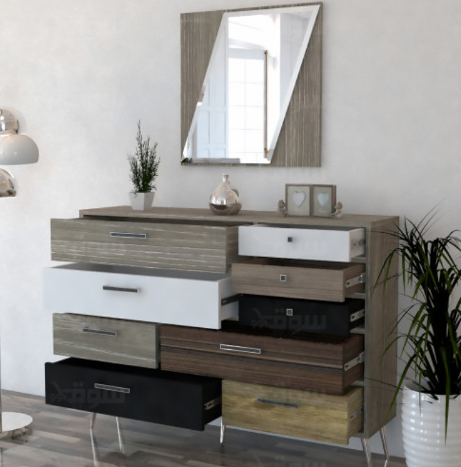 تحتوي الخزانة على ٩ ادراج سحب مُستخدم بها أجود الخامات ومصممه بشكل انيق والوان متناسقة.